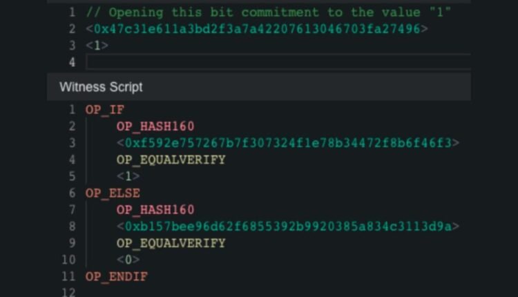 Bit Value Commitment, a Bitcoin script, employs if-else statements to implement a commitment scheme. This cryptographic primitive makes sure that the sender can confirm the message’s content before sending it, and the content cannot be altered once it’s publicly disclosed. This commitment scheme encompasses two hash values, hash0 and hash1. Whether the returned value will be 0 or 1 is determined by comparing the hash value of the input to these two hash values.