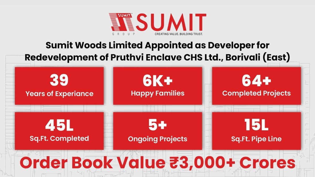 Mumbai (Maharashtra) [India], December 17: Sumit Woods Limited, a legacy name in real estate, has been officially appointed as the developer for the redevelopment of Pruthvi Enclave Co-operative Housing Society Ltd., located in Borivali (East).